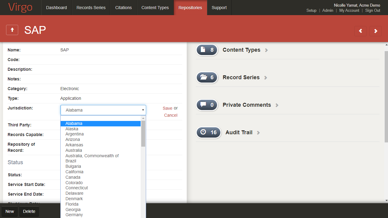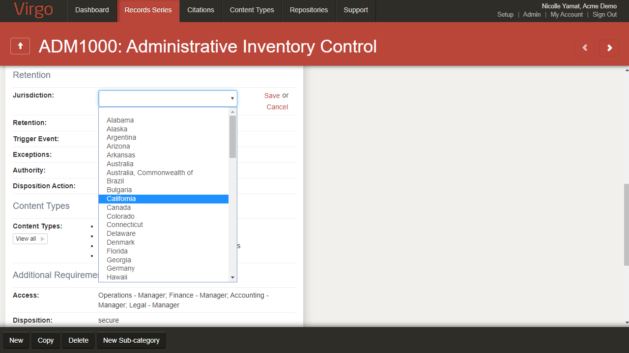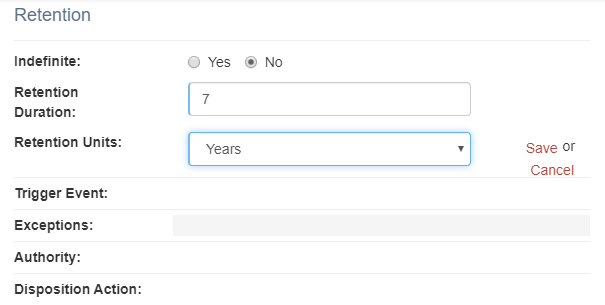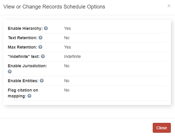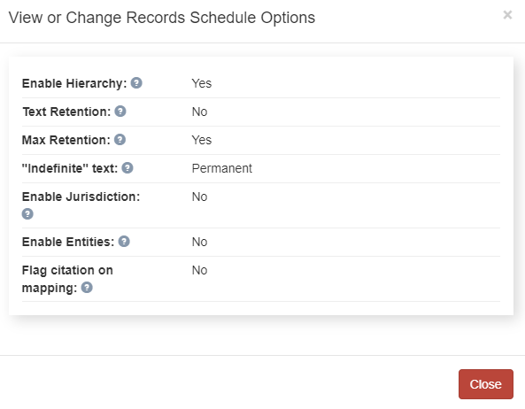 Access Unify | Lifecycle lets a user with full control of the page to enable or disable record series configuration features by clicking on the gear icon in the lower, right corner of the Record Series tab. The View or Change Records Schedule Options page displays.
