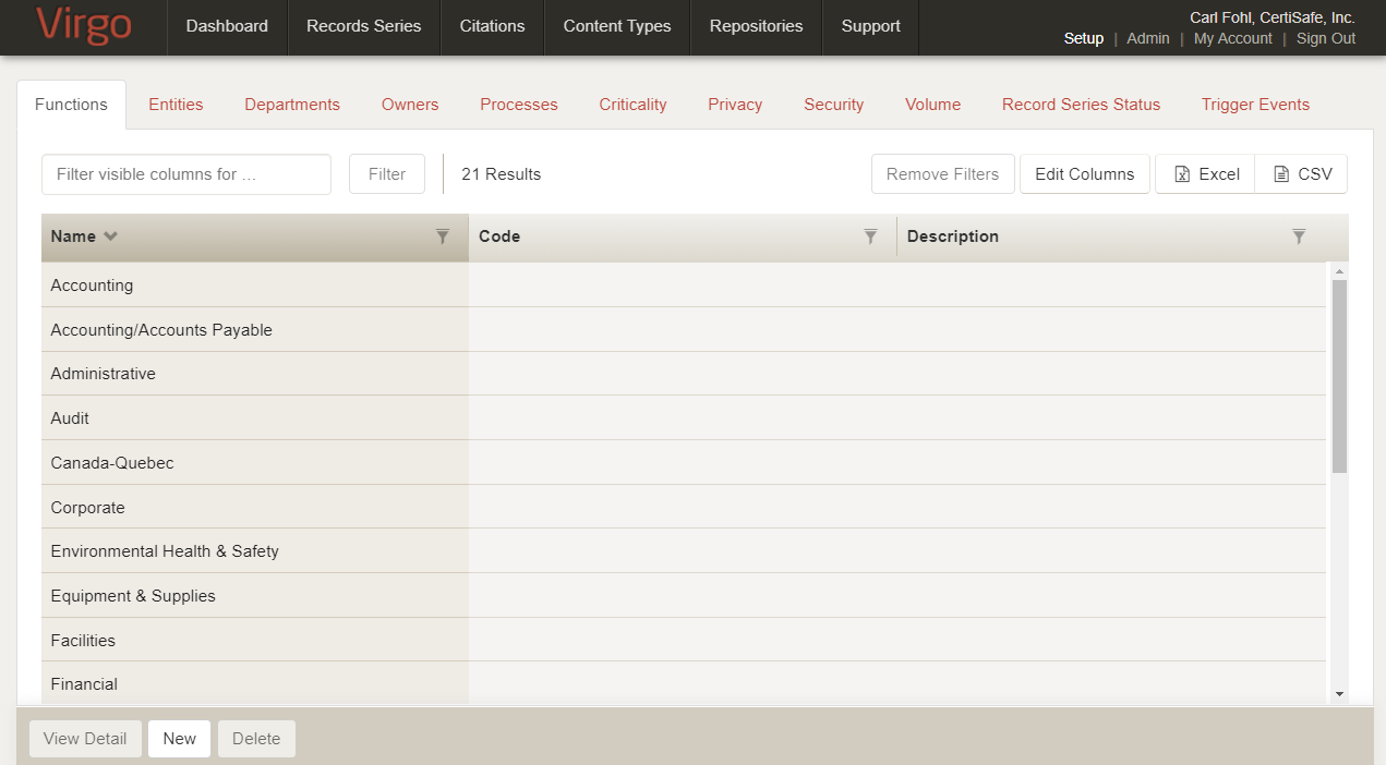 The Setup tab lets Administrators and others with permissions determine the values for drop-down fields. For example, the values of the Status field a user can select the Record Series details are determined by the Record Series Status values in Setup.