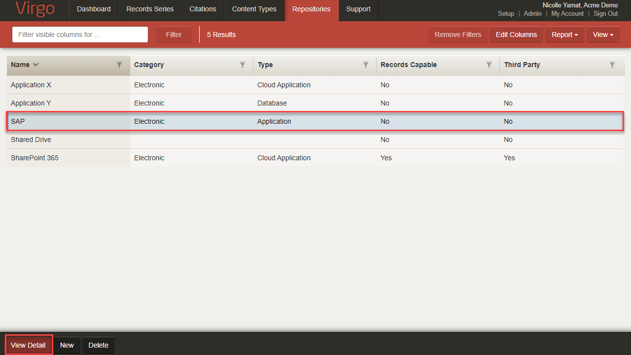 - To view the details of a repository or edit a repository, select the repository, and click View Detail.