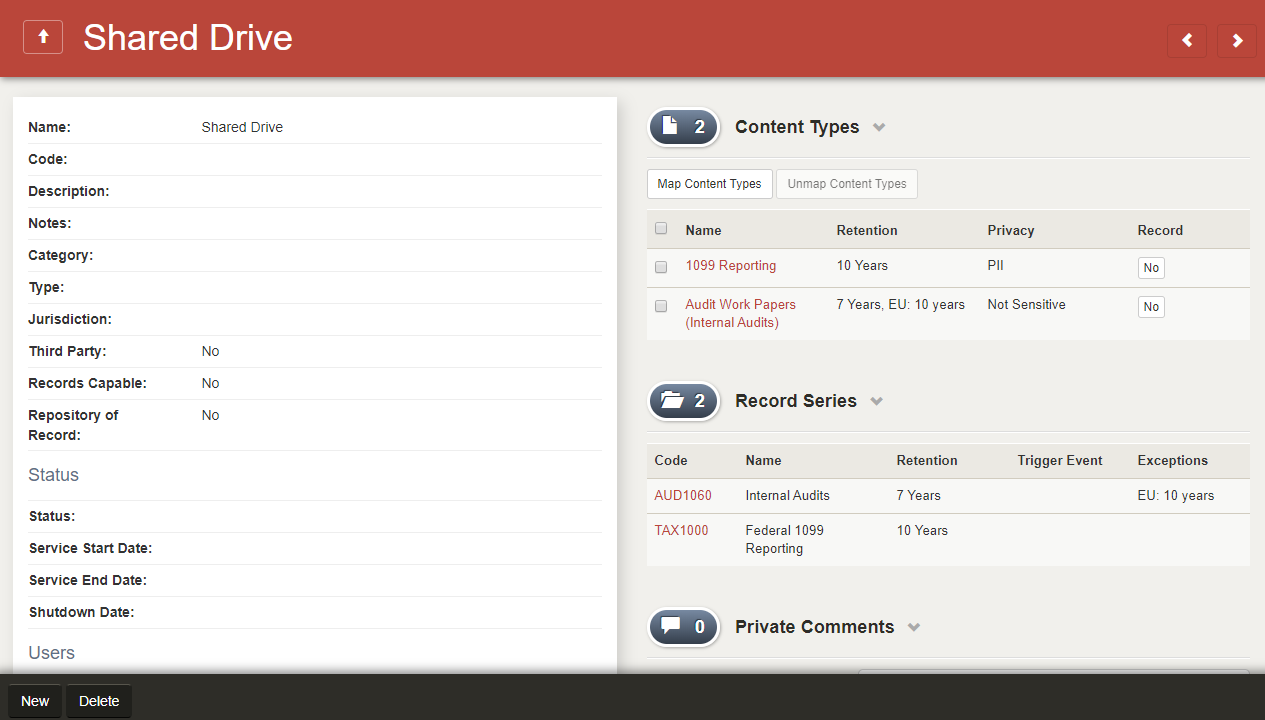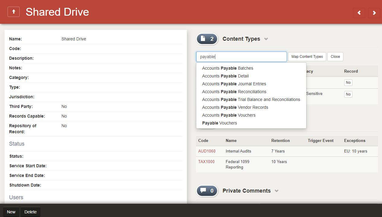 Access Unify® | Lifecycle lets you identify the repositories used for each content type. You can also identify which of the repositories holds the official record. Alternately, select a repository and add the content types under management, also with the option to identify which content types represent the official record in this repository.