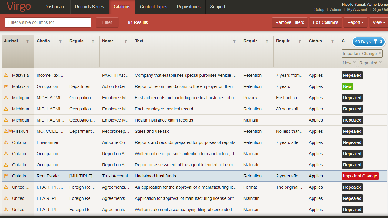 As the Virgo research team updates the citation database, updates are categorized as Important, Minor, New, No Change, and Repealed. Citations that are New or Important will be flagged automatically. Citations that are Repealed and are mapped to a record series will be flagged automatically too. Minor changes are clerical in nature and are not flagged by the system.