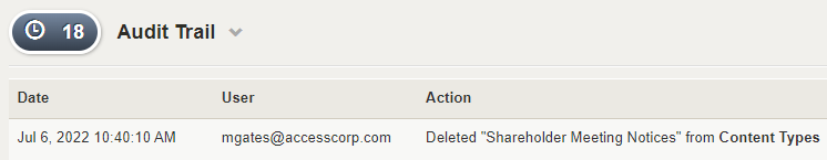 Previously, when you deleted a content type or department that was associated with a record series, the Audit Trail on the Record Series Details page only displayed the event after there was subsequent event. The Audit Trail on the Record Series Details page now logs any events without a delay.