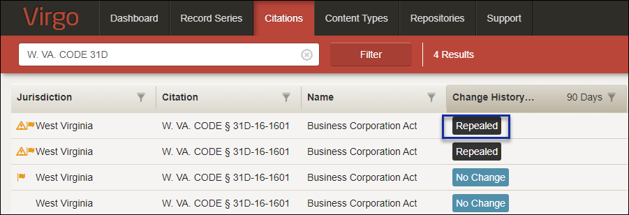 Repealed citations are no longer in effect. Previously, on the Citations page, the Change History column incorrectly displayed a No Change indicator instead of a Repealed indicator for repealed citations. Now, when the Research team marks a citation as repealed, the following day the Change History column displays the Repealed indicator.