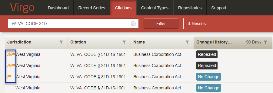 Also, Repealed icons and any review flags display correctly in the Citations grid.
