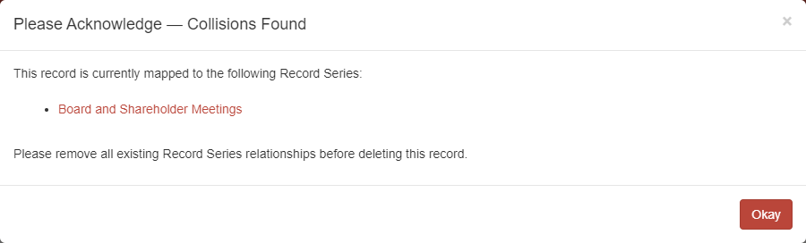 For example, you want to delete the Shareholder Meeting Notices content type. But the Shareholder Meeting Notices content type is associated with the Board and Shareholder Meetings record series. On the Record Series Details page for the Board and Shareholder Meetings record series, specify another Content Type. Then you can delete the Shareholder Meeting Notices content type.