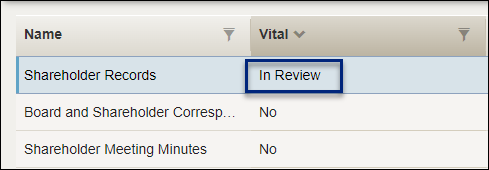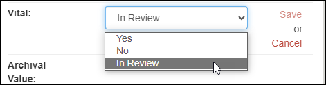 And when editing an existing records series a user can select the new In Review status in the Is Vital field: