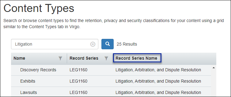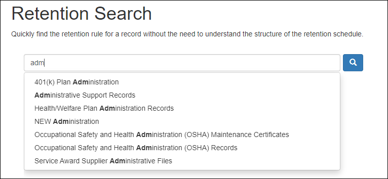 To help you more easily find the information you need, the Retention Search view page and the Content Type Search view page of the Employee Portal supports predictive search. You can enter the first three characters of a document type, content type code, or content type keyword. The portal will suggest content types associated with your organization's retention schedule.
