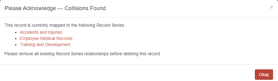 On the Content Types page if you try to delete a content type that is mapped to a record series, a message displays to select another content type for the record series before deleting the content type.