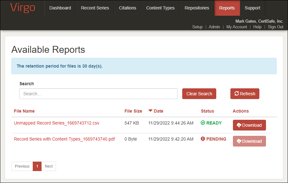 If the Reports tab is enabled, when you generate a report, the new Reports tab displays the report status and lets you download the report.