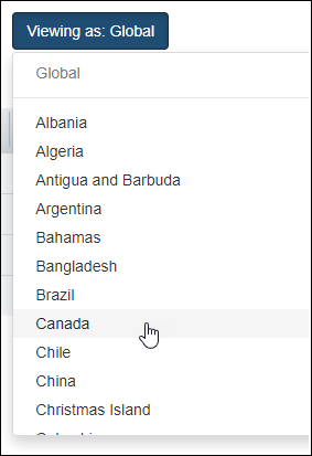 If the Hierarchical Exceptions feature is enabled, on the Retention Schedule view you can click the Viewing as button and select a jurisdiction. For example, you can display only retention schedules for Canada.