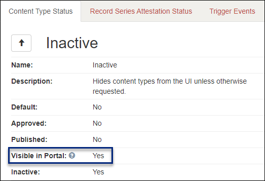 The new Visible in Portal field on the Content Type Status page indicates if the content type displays in an active Employee Portal view.